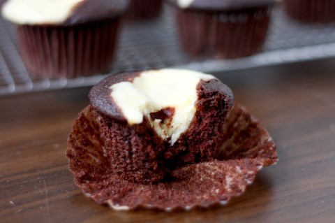 Having cream cheese on hand is especially important if you like to whip up birthday treats for people at the last second. Although deliciousness is always my main priority, portability is also an issue. These cupcakes are perfect: a moist, chocolatey cupcake is stuffed with a rich cream cheese filling, studded with dark chocolate chunks. No frosting needed! They can be stacked, toppled, and they still arrive in pretty decent shape. Also, they’re very very yummy, and always well received. An extra cupcake went to my roommate, who reported: “The texture is perfectly fluffy and omg there are chocolate-y bits in there! However, one major issue with this cupcake is that there’s only one of it here, or was.” Luckily the recipe makes twelve, so you can avoid this problem for approximately one day.