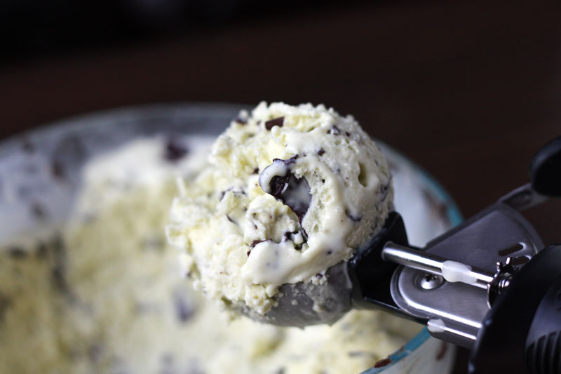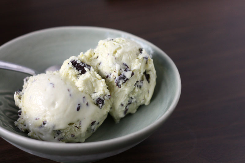 Luckily for me, mint is incredibly tenacious. It’s basically a weed, so I figure if I just stay away from it, it’ll grow. Now it’s overtaken a fair chunk of my backyard, and I have a continuous supply of mint for any of my baking needs. The first thing I’ve used it in is this ice cream, and it was really incredible. It’s very different from storebought mint ice cream – I think it tastes more herbal, both because the mint is fresh, and because it’s spearmint as opposed to the more common peppermint. I folded chocolate in, because I love it, and the crackling bittersweet shards were a great contrast. It’s really a spectacular ice cream and I recommend that you plant some mint just to make it. But if you lack my superior gardening skills, I’m sure the farmer’s market has some that will work just as well.