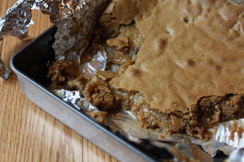 However, I should have taken a cue from the cards themselves. The chocolate dream brownies called for no butter, only shortening. The rum balls were definitely a product of their time. Suspicious, I still decided to attempt the butterscotch bars, and here is the gooey mess that ensued: