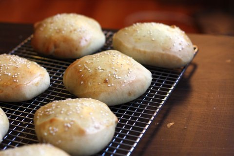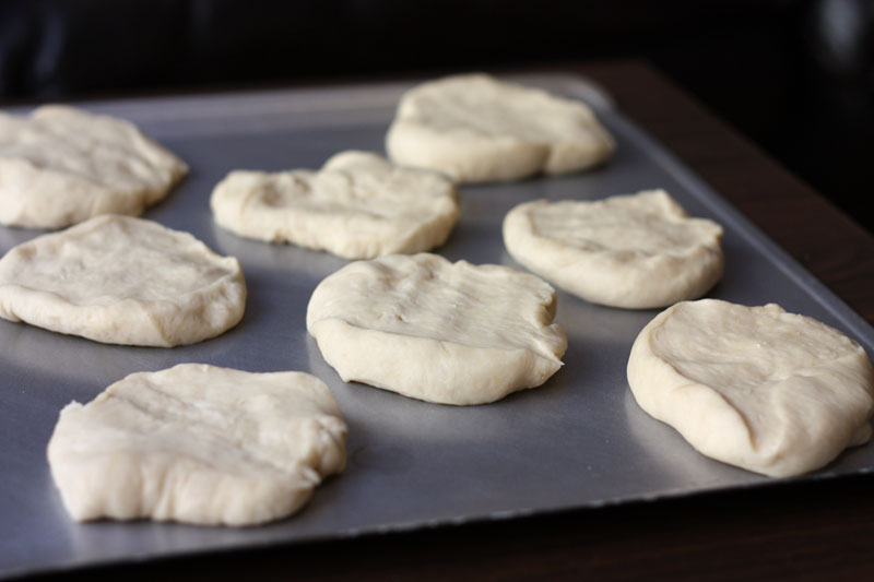 Gently deflate the dough, and divide it into 8 pieces. Shape each piece into a round 1 inch thick; flatten to about 3 inches across. Place the buns on a lightly greased baking sheet, cover, and let rise for about an hour, until very puffy.