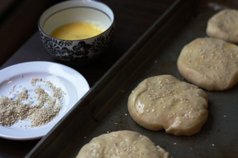 Beat egg with water, and brush lightly over buns. Sprinkle with sesame seeds.