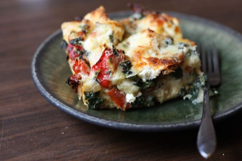 Triple-Cheese Spinach Strata with Sundried Tomatoes and Peppers