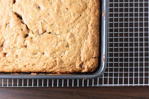 Spread batter evenly in pan and bake until golden-brown and a wooden pick inserted into center comes out clean, 40 to 45 minutes. Cool in pan 15 minutes. Run a knife around edge of cake to loosen, then invert onto a plate. Reinvert cake onto a rack to cool completely.
