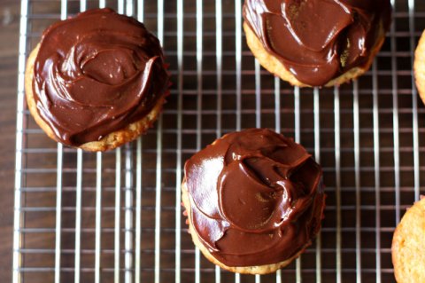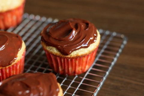 I was looking for a recipe that would give me fluffy, cakelike cupcakes, and I completely missed the mark. These cupcakes are dense, moist and banana bread-y. Luckily that’s pretty delicious too. The cupcakes were cute and tasty, but the best variation was when I microwaved the ganache and poured the warm chocolate all over the extra little cake I made with leftover batter. If you don’t need to transport your dessert, definitely do it this way – just unwrap the cupcakes first to avoid accidentally eating the paper in your haste to devour the chocolate. Not that I would ever do that.