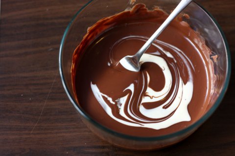 For ganache, gently melt chocolate in microwave or on top of double boiler. Add cream and stir until smooth. Let sit until no longer warm, about 15 minutes. Gently whisk in butter, without stirring too vigorously so as to avoid forming air bubbles. Use immediately or wait for it to thicken over the next hour, depending on the consistency you want to work with.