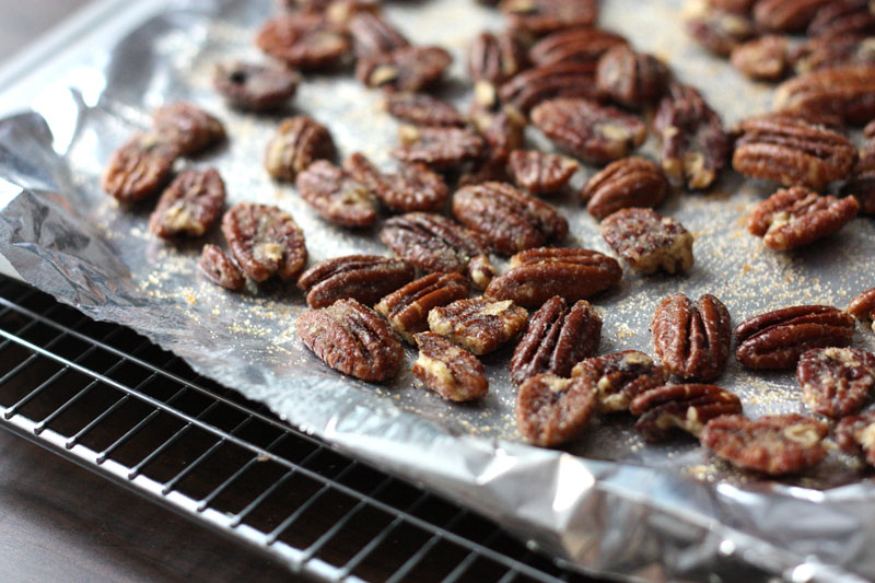 Lower heat to 325°F and line a baking sheet with foil. Toss pecans with vegetable oil. In a small bowl, mix sugar, cayenne, and salt, then add to pecan mixture and toss to coat. Scatter on baking sheet and toast, stirring occasionally, until brown and crisp, 10-15 minutes. Let cool completely.