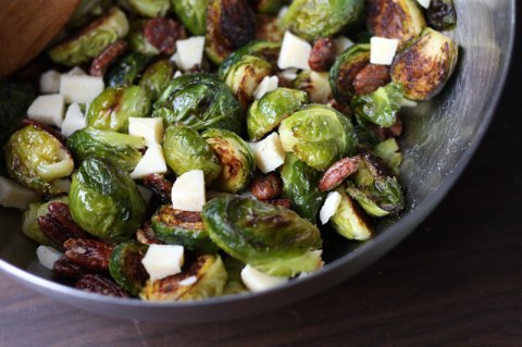 The quantities are a bit approximate: aim for the sprouts/nuts/cheese ratio that will make you happiest. Also, this dish would be great served warm; just leave out the dressing.