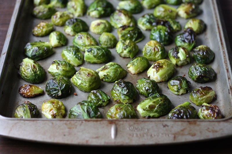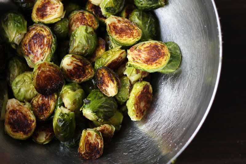 Preheat oven to 450°F and position rack in upper third of oven. Trim ends of brussel sprouts and cut in half. Toss with olive oil to coat, sprinkle with a pinch of salt, then arrange on baking sheet with cut sides down. Roast until browned and tender, 20-25 minutes.