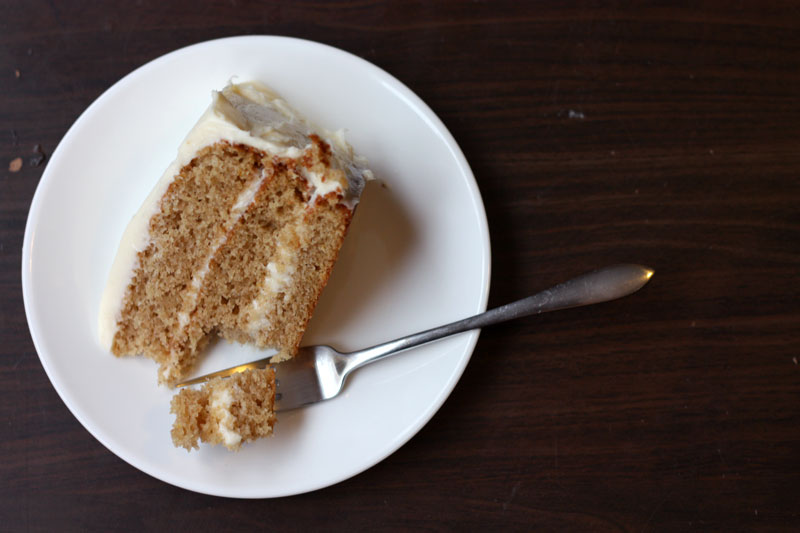 That turned out to be an extremely good idea. I picked a simple applesauce cake: one layer, cream cheese frosting. I spilled flour everywhere, and accidentally wildly overbeat the batter by my apparent inability to understand basic speed controls, and it was still delicious! I even somehow managed to leave an unmixed swirl of applesauce running through the cake, and this indestructible cake rose perfectly anyhow.