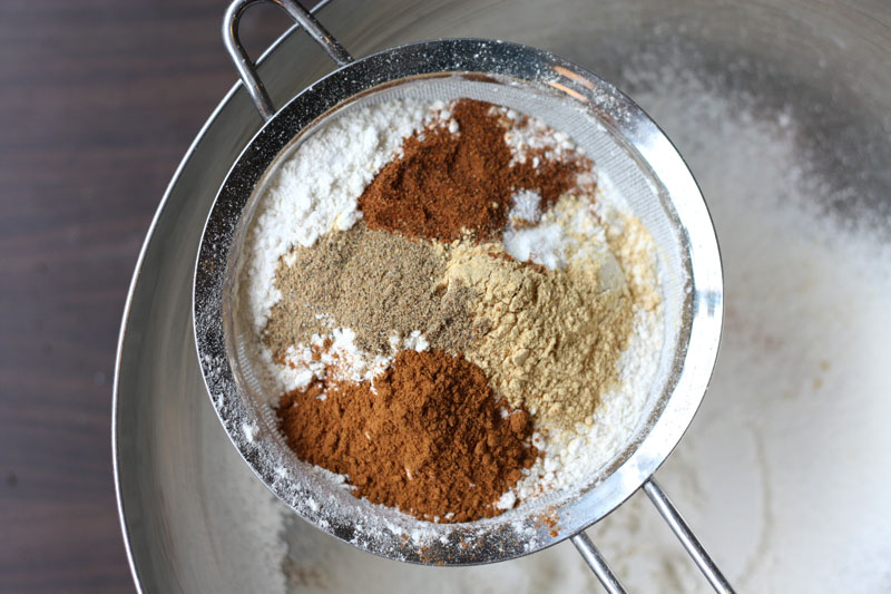 Whisk together flour, baking powder, baking soda, salt, and spices, and set aside.