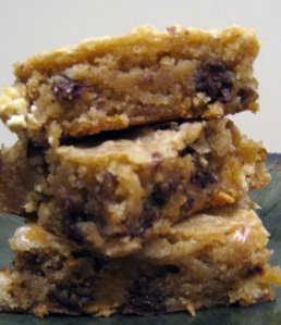 They were also kind of ugly. They don’t make for spectacular presentation, as can be seen in the photo. I think blondies are sort of inherently unattractive, because a yellow block with dark chunks just isn’t going to look super appetizing.