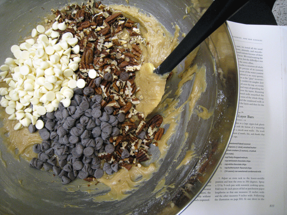 Fold in the semisweet and white chocolate chips and the nuts, and turn the batter into the prepared pan, smoothing the top with a rubber spatula.