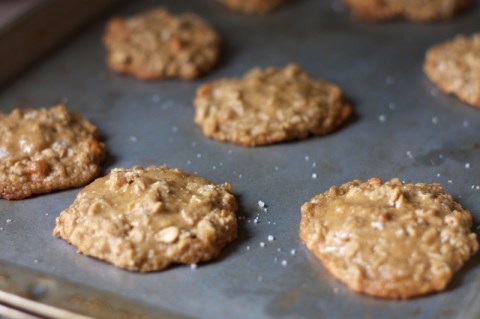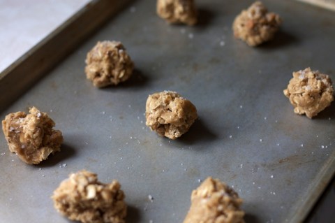 I had a bag of butterscotch chips lying around, which I had never tasted before let alone baked with, so I decided to start with the recipe on the back of the bag. Oatmeal cookies with butterscotch chips sounded like a pretty decent combination. This recipe was incredibly easy, but when I tasted the dough I already knew there was going to be a problem. I guess I’m new to butterscotch, and wasn’t prepared for the cloyingly sweet taste. But after doubling the salt, and then sprinkling with fleur de sel (taking this back-of-the-bag recipe decidedly upmarket), the result was incredible: sweet but salty, nutty from the oats, kinda sticky, generally delicious.