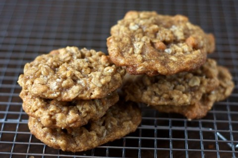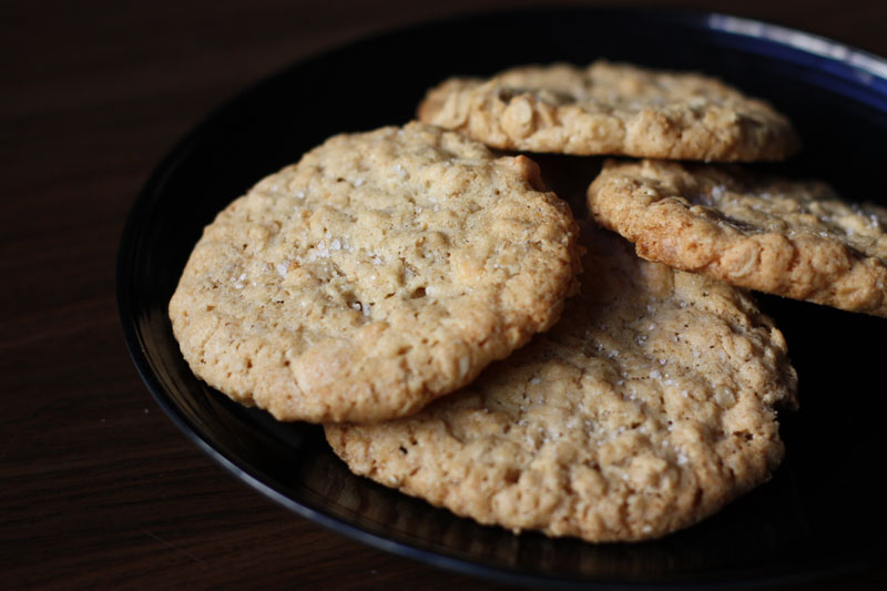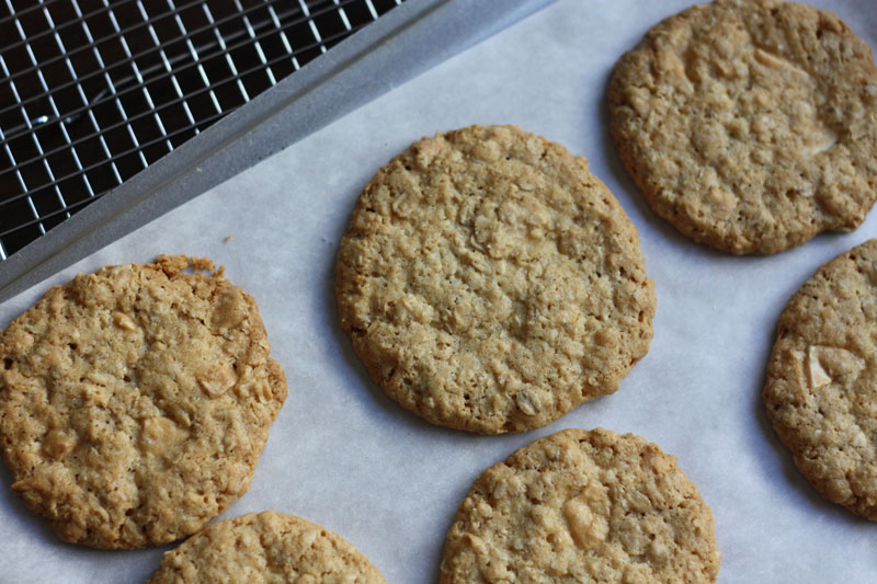 Luckily I also had white chocolate disks, and cookies were promptly baking. These cookies are both delicious and unusual – they’re a departure from the typical soft and chewy oatmeal cookie, but instead are thin and crisp and nearly hollow, and they fall neatly in line with my love of all things salty. In the end, the hurricane only managed a bit of rain and then lots of sun the next day, rendering my cookies unnecessary, but somehow no one minded having them around.