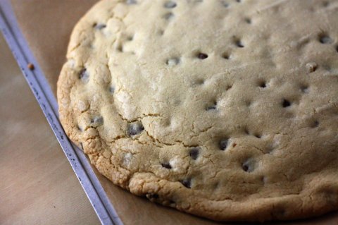 Line a large (11X17-inch) baking pan, preferably unrimmed, with foil or parchment and press the cookie into a circle. I pressed my cookie into a 9-inch circle, about 1/4 to 3/8-inch thick. When it bakes, it spreads to about 11 inches (Mel points out that this fits perfectly onto a 12-inch round cardboard circle you can find at most craft stores, if that makes transportation easier.)