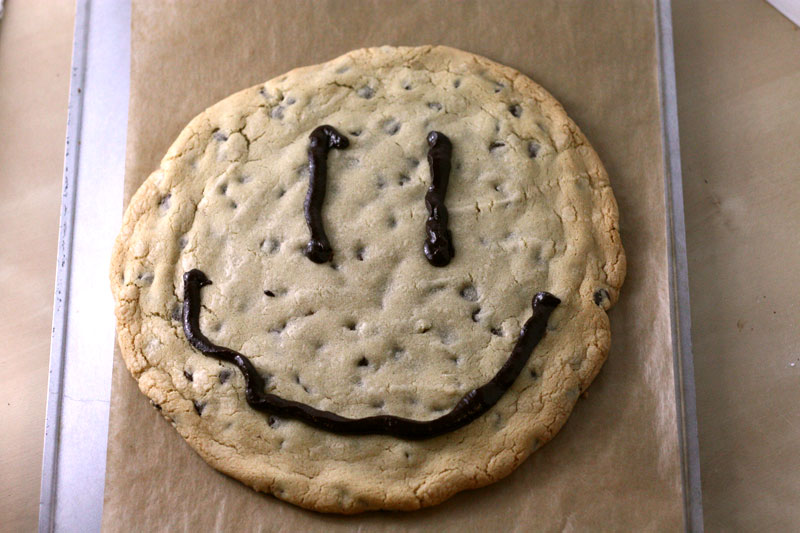 Then, in a flash of brilliance, I realized that I could make cookies at home that were also giant, and thereby also more delicious! And here I think bigger really does taste better, because the size makes for a high proportion of gooey center, which we all know is the best part. This recipe is pretty perfect for giant cookies: it’s a sturdy dough that manages to bake fairly even across the gigantic cookie, yielding crispy-chewy texture that’s incredibly addictive. Also, the strategic placement of a bittersweet ganache both balances out the sweetness and increases the adorable quotient.