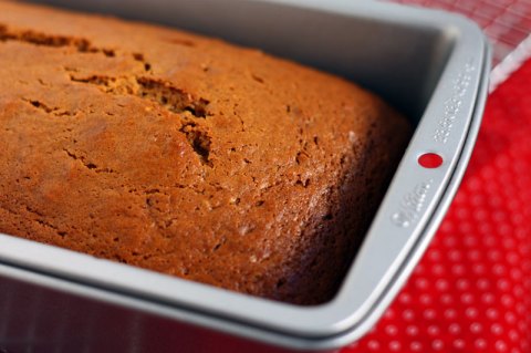 Pour batter into two prepared pans. Bake until a tester comes out clean and the top is golden, about one hour. Cool in pan for ten minutes, then run a knife around the sides and turn out onto a wire rack.