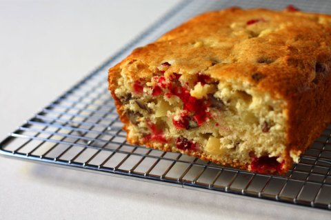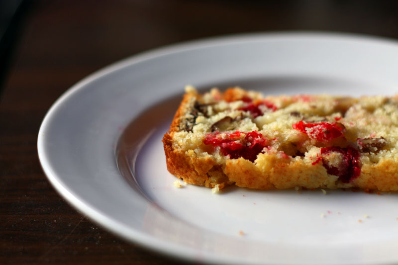 I currently have approximately a bajillion cranberries left over from overenthusiastic Thanksgiving grocery shopping. I know they keep well for a while, but I think I’m starting to push my luck, so a series of cranberry items have begun to appear in my house. The first was this apple-cranberry pecan loaf, which I have to say is quite a respectable use of cranberries.